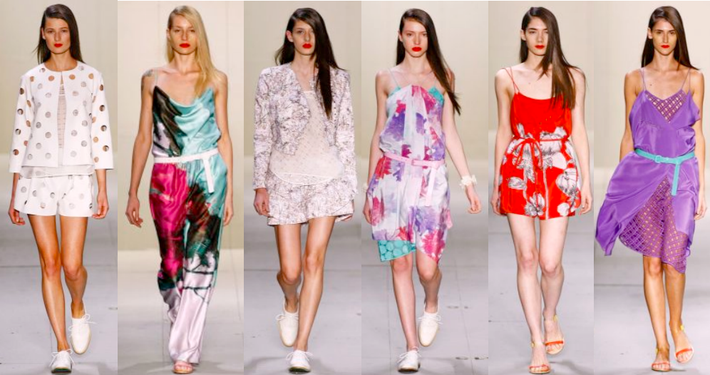3) Maria Bonita Extra: a coleção foi inspirada no Highline Park, em Nova York, um parque suspenso que fica no Meatpacking, onde antes funcionava uma estação de trem. O shape foi inspirado nos anos 30 e o desfile contemplou a sobriedade. Apesar de cores quentes e abertas, como laranja, vermelho e roxo, a calmaria do branco predominou. Foram muitos os looks monocromáticos, mas não por isso eles perderam a graça. A graciosidade da grife foi sobrepor texturas de mesma cor. Uma camiseta de paetês, é coberta por uma bata lisa de seda e um blazer de bolinhas recortadas. A combinação de cores mais presente foi vermelho com roxo. Macacões de alcinha em seda apareceram mais de uma vez na passarela. Estampas florais deram romantismo à coleção. Terninhos de short balonê e blazer de manga e comprimento curtos apareceram pela primeira vez na semana de moda carioca. Vestidos de comprimento midi e longos ganharam corte diagonal e também apareceram transpassados como um quimono. Nos pés, o oxford ganha versão de verão tipo babouche, com o calcanhar aberto. Os tecidos utilizados foram: organza, seda, crepe de chine e cetim.